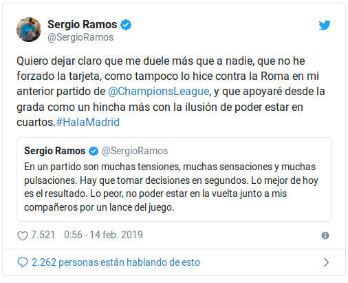 La UEFA podría sancionar a Sergio Ramos con dos partidos sin jugar por confesar ante los medios de comunicación que había provocado la tarjeta amarilla a propósito para no jugar la vuelta contra el Ajax en el Bernabeu. No nos podemos explicar cómo un jugador con su experiencia ha podido cometer este error de infantil.